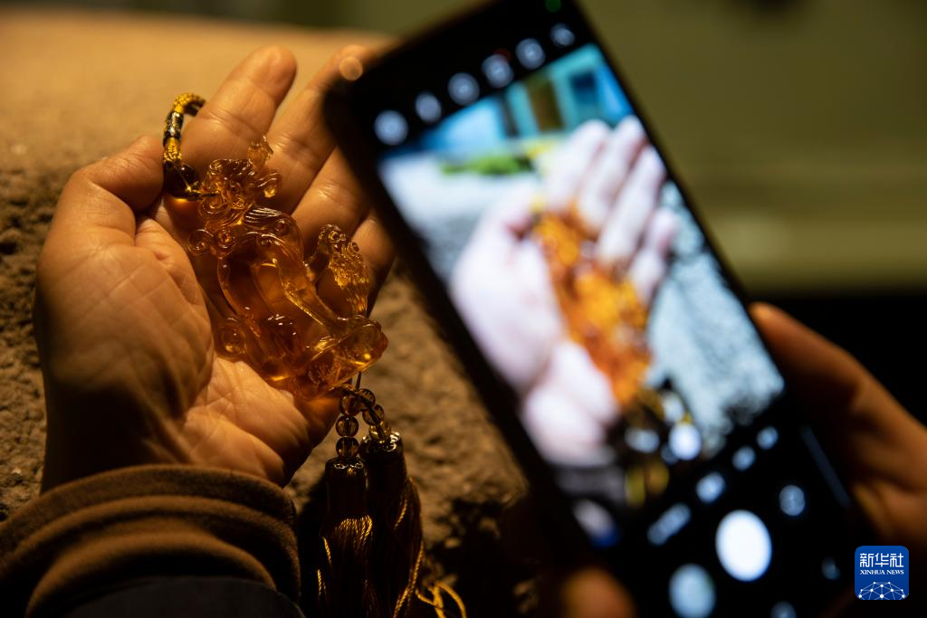 5月16日,在黑龙江省博物馆,工作人员拍摄以铜坐龙为原型设计的琉璃饰品。