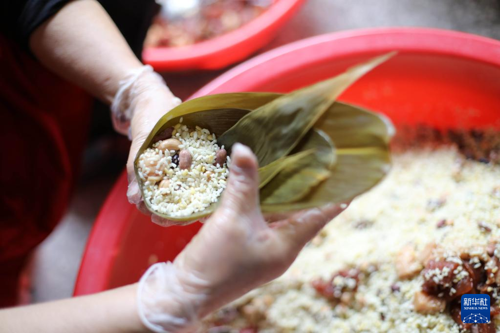 5月28日,湖南省永州市道县西洲街道西洲社区的居民在包粽子。