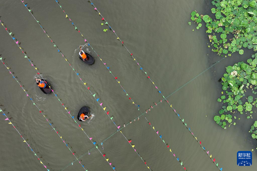5月28日,在浙江省湖州市吴兴区,当地村民在荷塘内参加端午划菱桶趣味活动(无人机照片)。