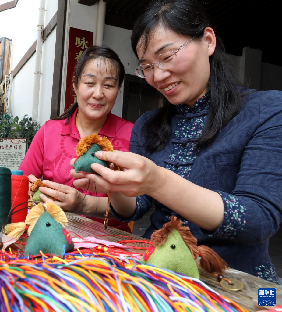 5月28日,安徽省淮北市香包制作手艺人杨海玲(右)在工作室带领工人赶制订单,制作传统香包。