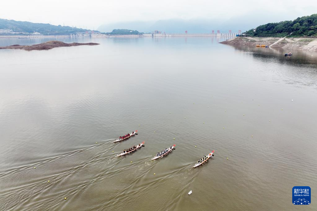 5月28日,在湖北省宜昌市秭归县,龙舟选手在三峡大坝附近水域进行龙舟比赛(无人机照片)。