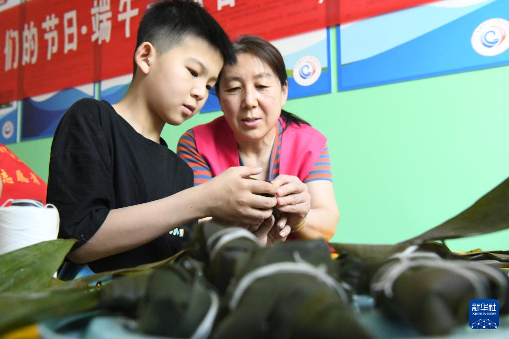 5月28日,在河北省邯郸市广平县,志愿者陪留守儿童一起包粽子。