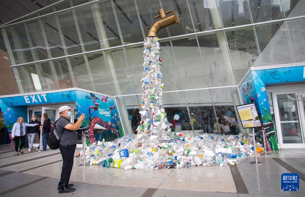 这是6月7日在加拿大多伦多的里普利水族馆外拍摄的环保艺术装置。该装置展示“流淌”塑料制品的水笼头,呼吁人们重视塑料污染问题。新华社发(邹峥摄)
