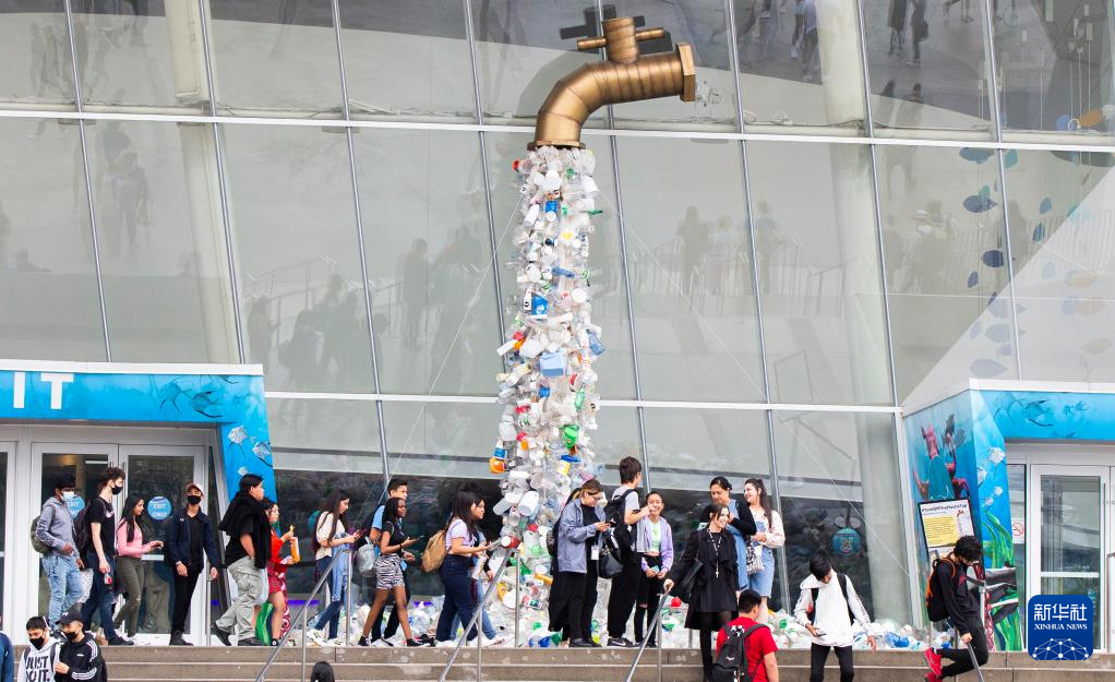 6月7日,人们从加拿大多伦多里普利水族馆外的环保艺术装置前走过。该装置展示“流淌”塑料制品的水笼头,呼吁人们重视塑料污染问题。新华社发(邹峥摄)