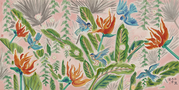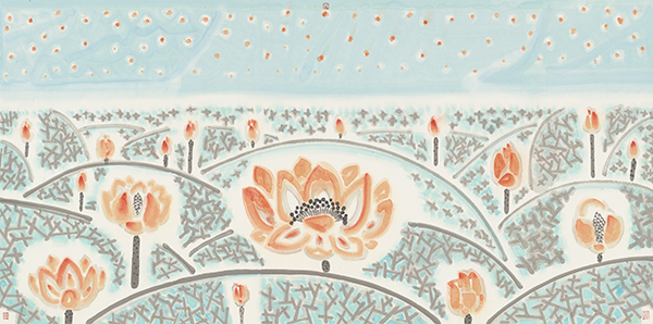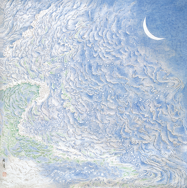 她汲取了唐宋诗词的清丽秀雅和恬静闲适,将自由与浪漫巧妙的掩映在画面的绵柔与静谧里,绽放着青春,张扬着瑰丽的生命精神。笔线已朴化为自然,早已打磨掉令人目眩的光彩,隐隐可见的是灵魂的游越,寂静得能够聆听到自然万物拔节的声音。作者似乎在试图走进天地精神的内里,找寻着生成万物生命的力量。清新一片的视域里流贯着生命的气息,散发着诱人的芳香。她画花,也喜欢画水画星空。喜欢将水置于月夜,让月亮荡漾着大海,不!是大海捧托着月亮、幽缈微茫中,星与月栖息在浪花里,似平在聆听苏子的感伤∶“客亦知夫水与月乎?”夜可以睡去,但我心依然激荡;夜可以深沉,但我心永恒闪亮。