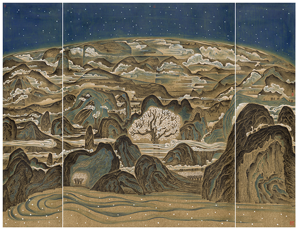 她的山水画很少,纯以凝重的墨线勾画的几幅峡谷系列,我大胆的设想其创作灵感可能出自岩画,否则哪会有那种远古沧桑之气!最感人的还是那幅送父亲的《从生命的内部发出一片光亮》,她因何在画面中心画了一棵大树?白色的树叶是它摘下来的星星?四面簇拥的群峰给了答案∶父爱如山!一句话天地震撼,万物回响。父亲是儿女心中的大树,是儿女最好的依偎,他创生出远超爱自己的生命,并倾心营造着眷顾生命的爱的港湾。感天地之华育,万物自呈光华。不难看出,画家在借艺术的料理调味着生活,品味着人生,体验着生命,安慰着灵魂。作品不仅带给你丰富而强烈的视觉美感,更让你从中看到漂泊的思想和内心的游越。宗白华说∶一个充满音乐情趣的宇宙是中国画家、诗人的艺术境界。的确,冬青的作品,可以让你聆听到《神曲》里对自由意志和现实生活意义的歌唱;让你体味到《春江花月夜》里歌舞升平的盛唐;可以感受到作者借艺术语言对人生哲理的探求和对宇宙自然的咏叹。点点含情,笔笔有思,余音袅袅,不绝如缕!她以含蓄隽永的梦幻之笔,将热烈而又深沉的情感融进画面,委婉有致,意味无穷。画面工而意境空灵,传统获得了现代的映照!