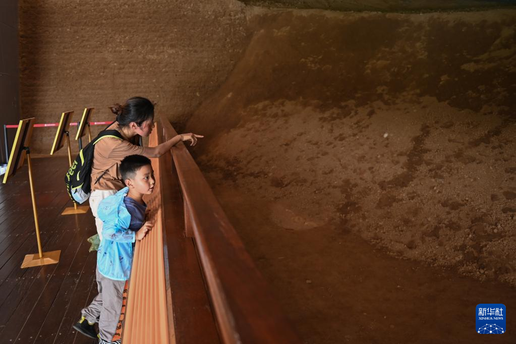 7月6日,观众在老虎岭水坝遗址展示馆内参观沙袋覆土回填保护区。