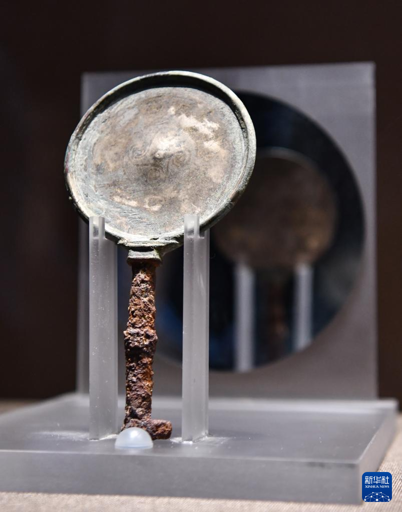 这是6月29日拍摄的西藏博物馆新馆展品——早期金属时代的铁柄铜镜。该铜镜出土于拉萨曲贡遗址,镜体为铜质,柄为铁质,镜背饰双鸟、卷草纹,似有牦牛图象。