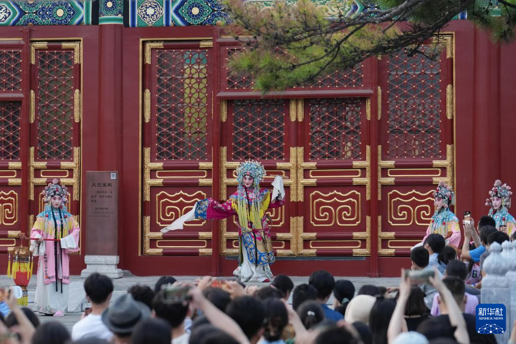 7月30日,市民游客在欣赏国家京剧院演员表演京剧《贵妃醉酒》。新华社记者 鞠焕宗 摄