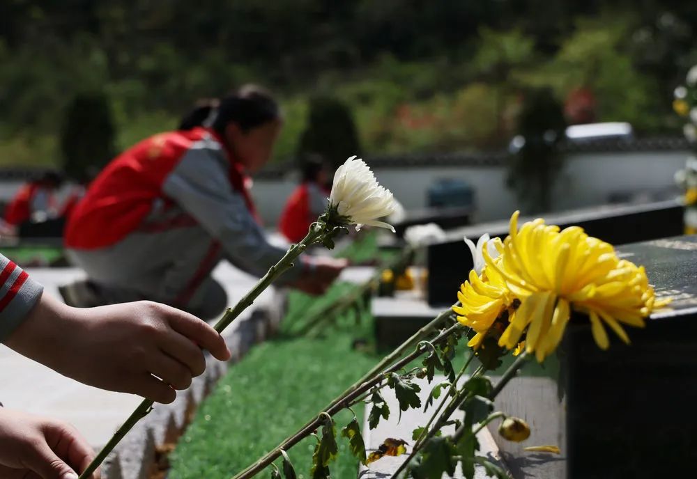 4月3日,学生在贵州省遵义市汇川区娄山关烈士纪念园向先烈敬献鲜花。新华社发(田锦泓摄)