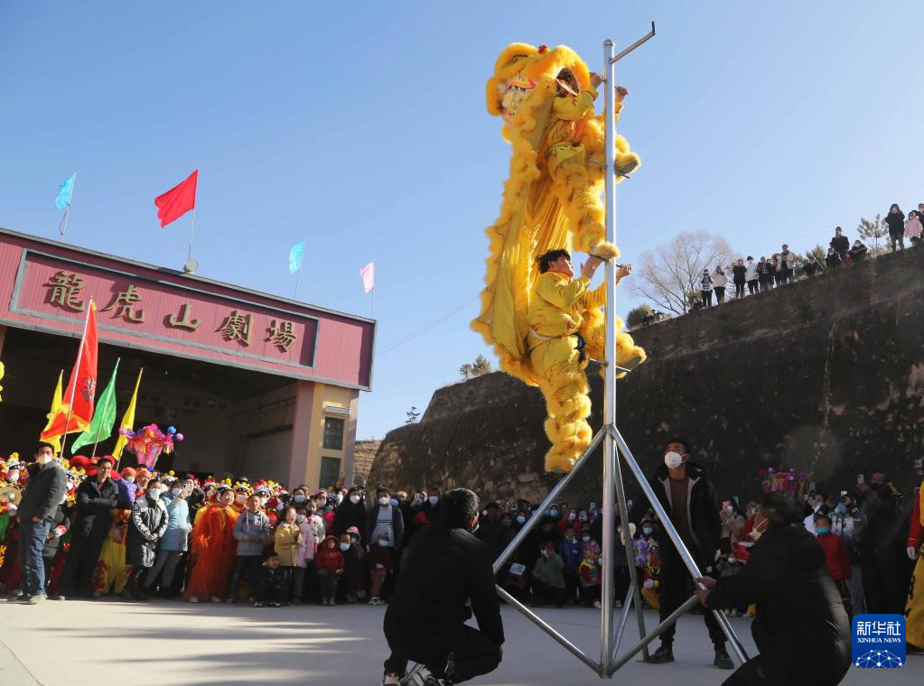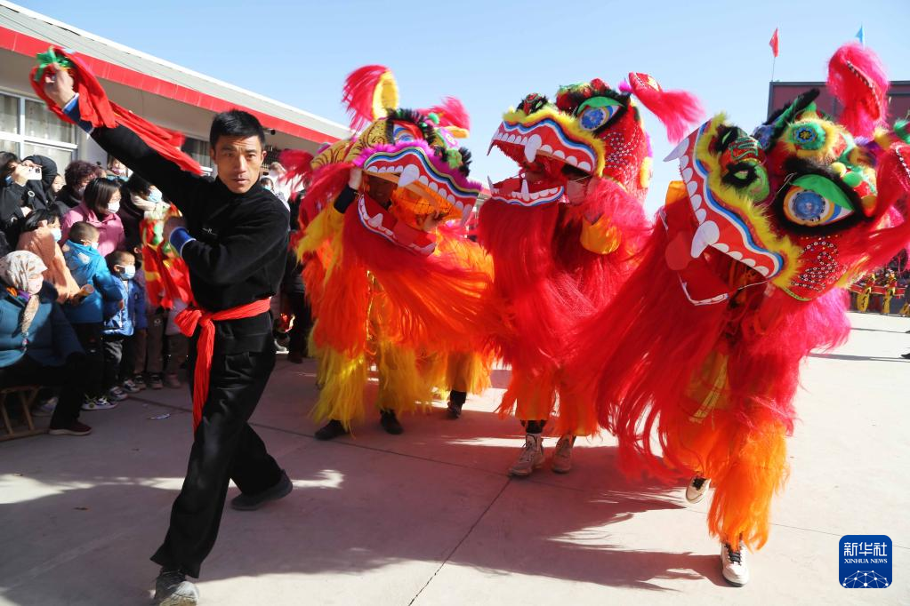 1月6日,甘肃省定西市安定区内官营镇万崖村社火队演练传统社火节目舞狮。