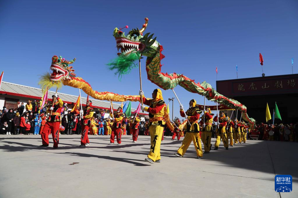 1月6日,甘肃省定西市安定区内官营镇万崖村社火队演练传统社火节目舞龙。