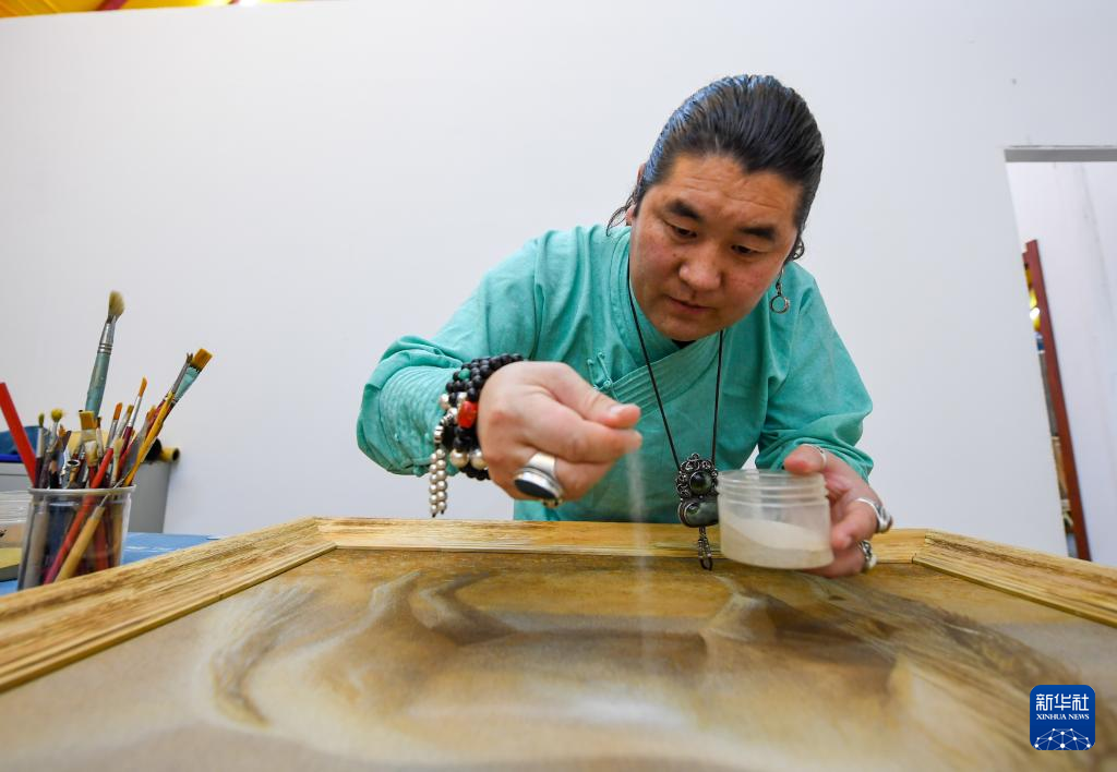 1月4日,阿拉腾毕力格在工作室内创作沙画。