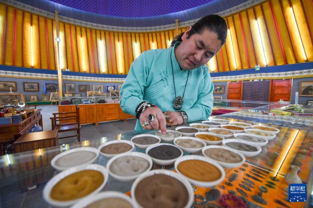 1月4日,阿拉腾毕力格在工作室内挑选沙粒。