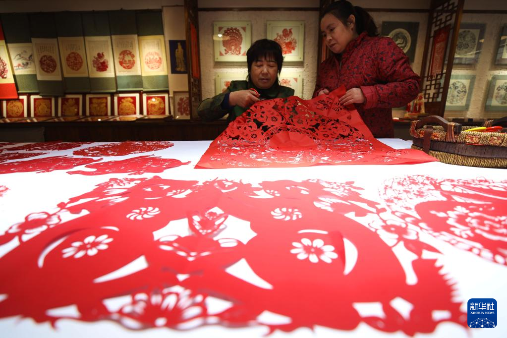 1月18日,在承德市双桥区俊凤剪纸创作室,剪纸艺人石俊凤(左)创作贺岁迎春生肖兔主题剪纸作品。