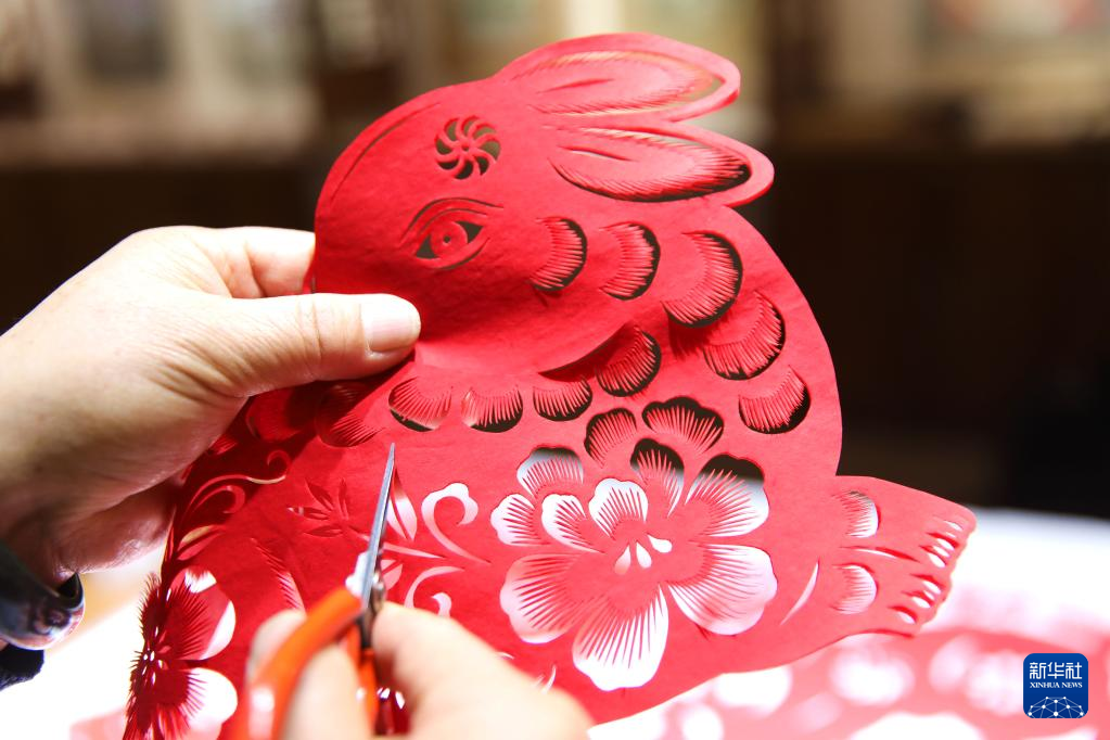1月18日,在承德市双桥区俊凤剪纸创作室,剪纸艺人石俊凤创作贺岁迎春生肖兔主题剪纸作品。