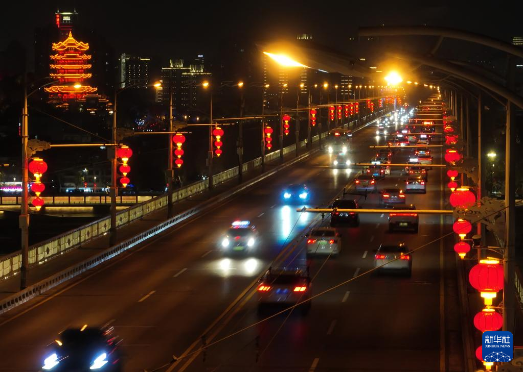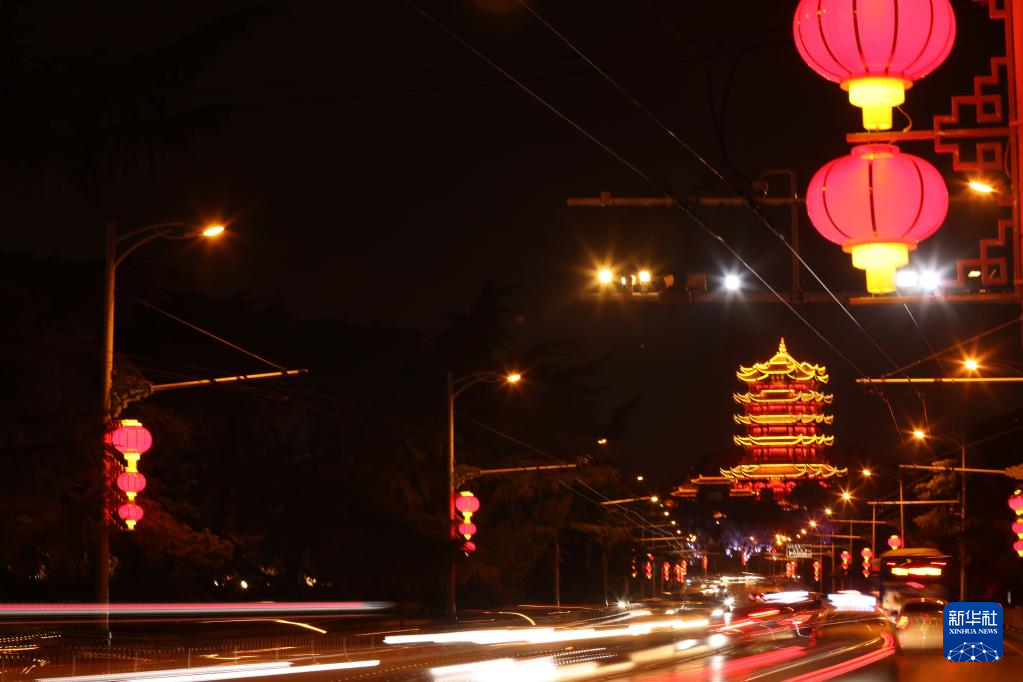 湖北省武汉市黄鹤楼附近路段夜景(1月17日摄,无人机照片)。