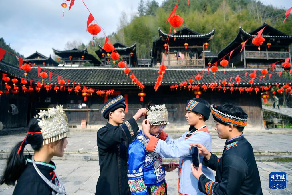 1月18日,在湖北省宣恩县沙道沟镇彭家寨吊脚楼前,游客换上土家族传统服饰游玩。