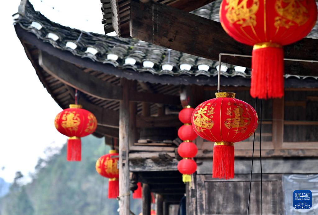 湖北省宣恩县沙道沟镇彭家寨吊脚楼悬挂着红灯笼(1月18日摄)。