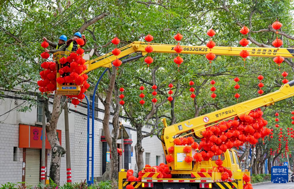 1月18日,在广西南宁市邕宁区红星路,市政工作人员悬挂灯笼。