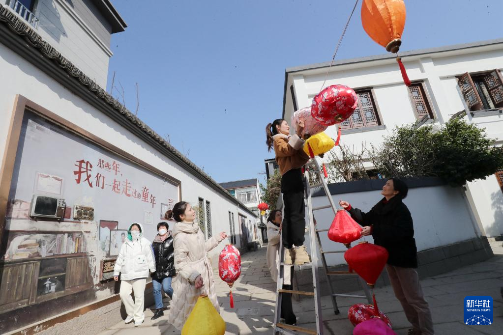 1月18日,浙江省湖州市德清县乾元古城的居民在弄堂里挂灯笼。