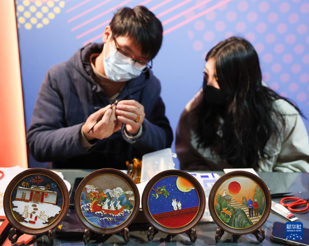 1月27日,游客在长沙非物质文化遗产展示馆体验景泰蓝掐丝珐琅技艺。