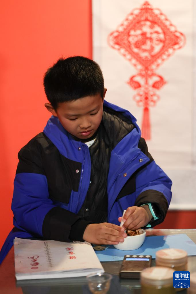 1月27日,小朋友在长沙非物质文化遗产展示馆体验传统和香制作技艺。