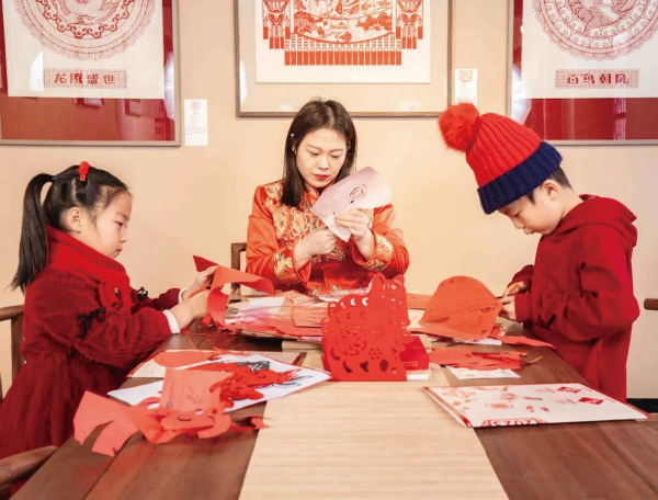 在山东烟台,剪纸非遗传承人梁巧燕指导小朋友动手体验剪纸艺术
