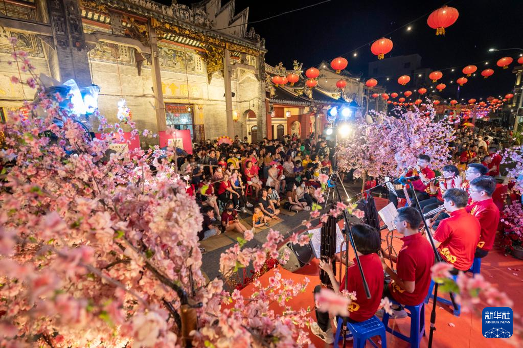 1月28日,人们在马来西亚槟城州首府乔治市举行的槟城庙会上观看表演。新华社发(张纹综摄)