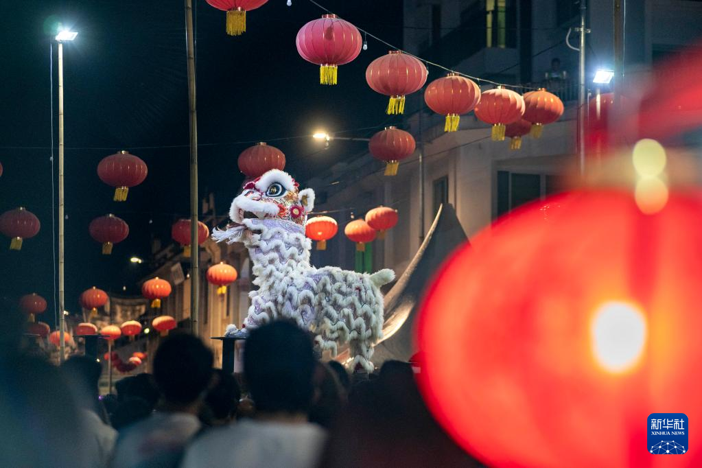 这是28日晚在马来西亚槟城州首府乔治市古迹区舞狮表演的一幕。当天,癸卯年槟城庙会如期举办。