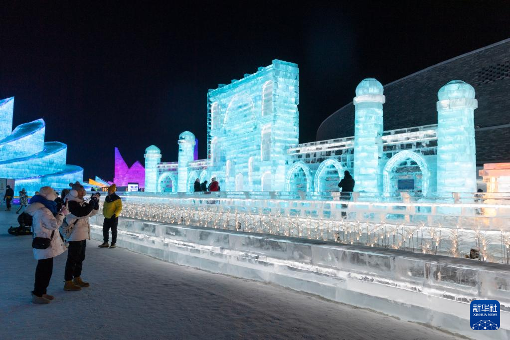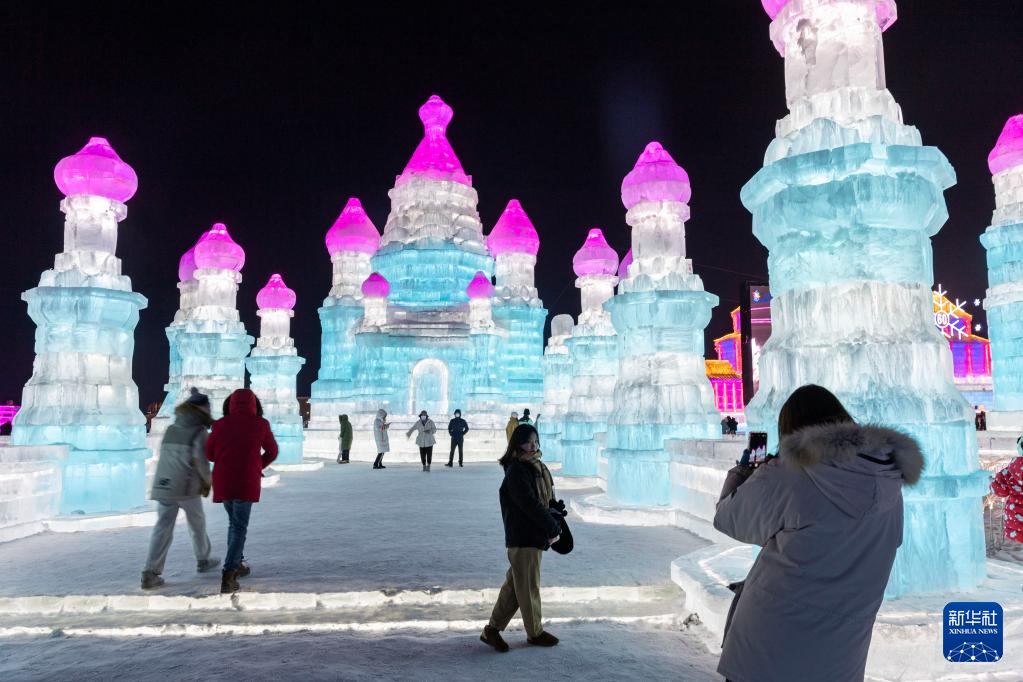 2月1日,游客在哈尔滨冰雪大世界园区冰雪景观《阿拉图广场》周边游玩。该冰雪景观以吉尔吉斯斯坦的阿拉图广场为原型设计建造。