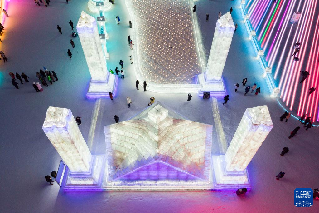 2月1日,游客在哈尔滨冰雪大世界园区冰雪景观《勇士广场》周边游玩。该冰雪景观以哈萨克斯坦的潘菲洛夫-28勇士纪念公园为原型设计建造(无人机照片)。