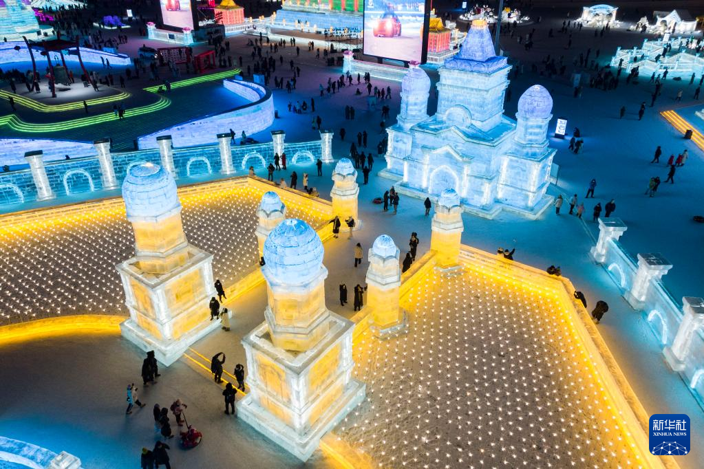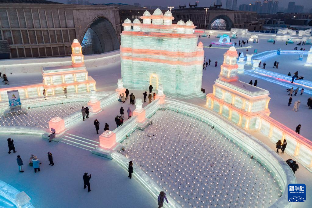 2月1日,游客在哈尔滨冰雪大世界园区冰雪景观《骑士广场》周边游玩。该冰雪景观以巴基斯坦的费萨尔清真寺为原型设计建造(无人机照片)。