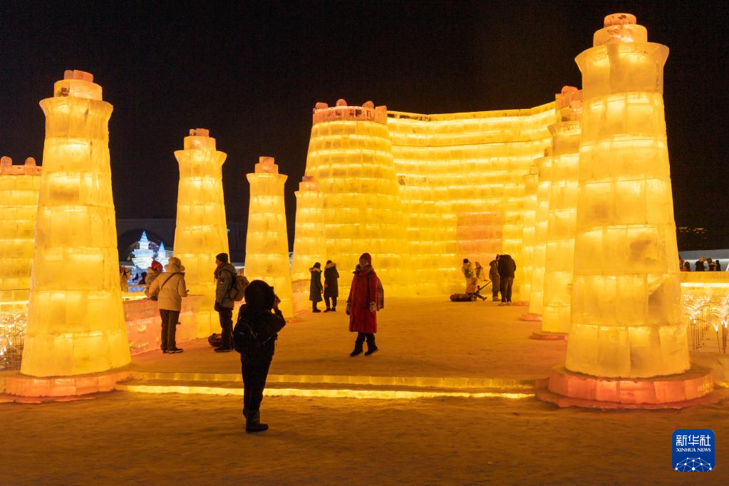 2月1日,游客在哈尔滨冰雪大世界园区冰雪景观《自由堡垒》周边游玩。该冰雪景观以塔吉克斯坦的苦盏博物馆为原型设计建造。