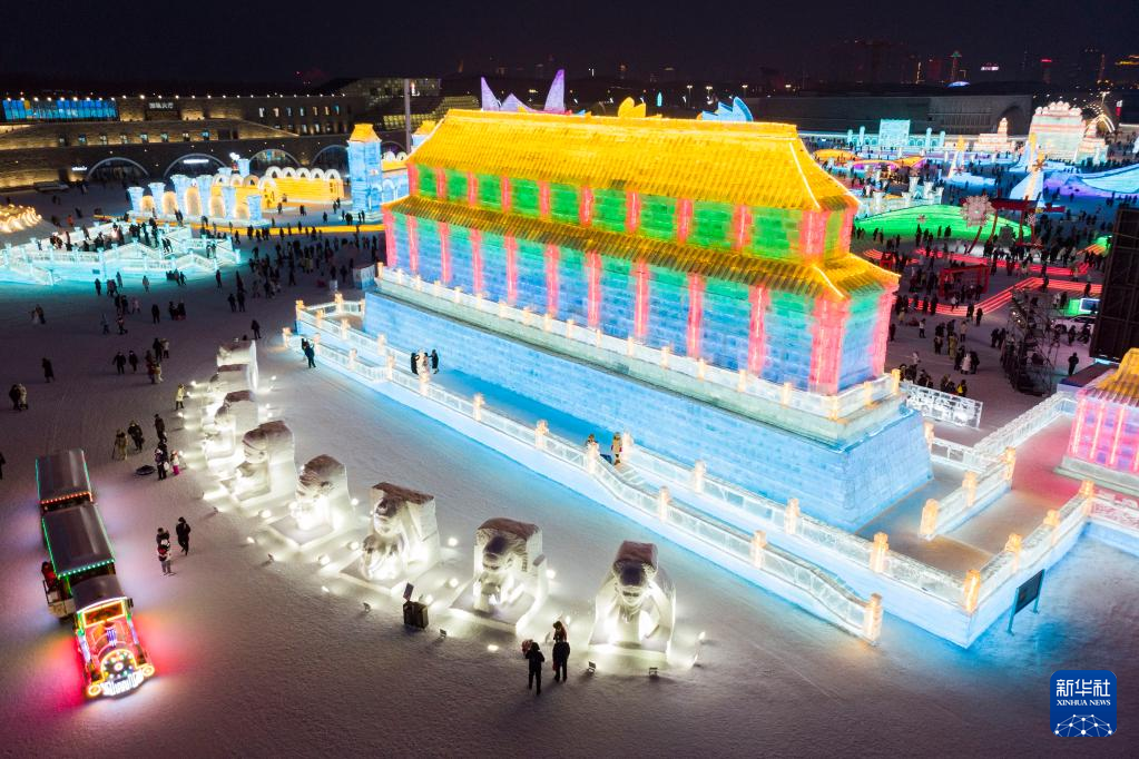 2月1日,游客在哈尔滨冰雪大世界园区冰雪景观《梦想大舞台》周边游玩。该冰雪景观以中国的太和殿为原型设计建造(无人机照片)。