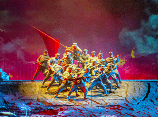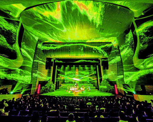 《酒曲人生》巧妙利用大量光影设计,将整个剧院打造成全景沉浸式的空间秀场,并巧妙运用AR\VR技术、光影全息技术、动态覆合、多维布景与全景舞乐等技术,打造真实震撼的星空、雪山、草地、战场……让观众置身剧院,沉浸式的体验四季的变化。