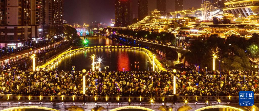2月5日晚,湖北省宣恩县仙山贡水旅游区的贡水河畔人山人海(无人机照片)。