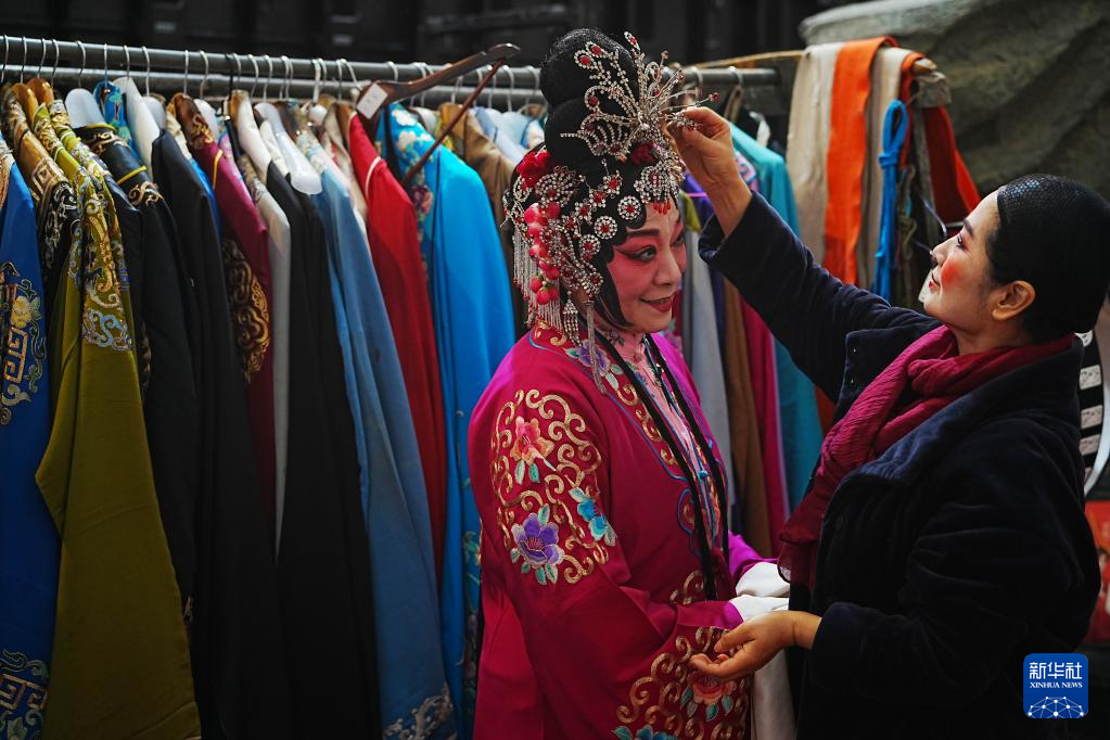 2月15日,演员在石家庄市鹿泉区南甘子村文化广场演出后台整理戏服和头饰。