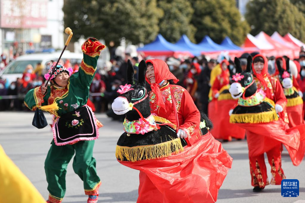 2月21日,在山西省临汾市襄汾县陶寺乡陶寺村,民间社火队在“二月二龙抬头社火节”活动中表演传统民俗“跑驴”。