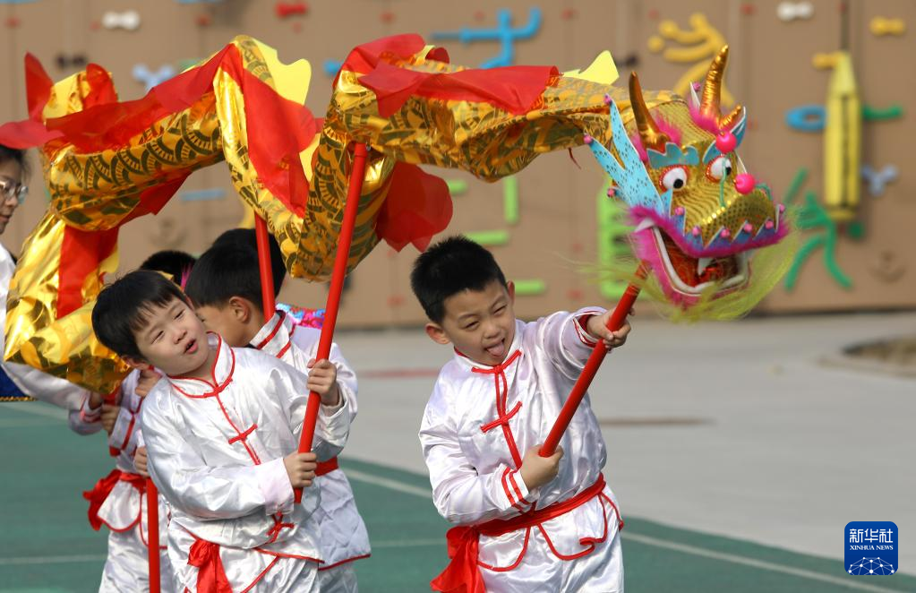 2月21日,小朋友在石家庄市第一实验幼儿园“舞龙”。