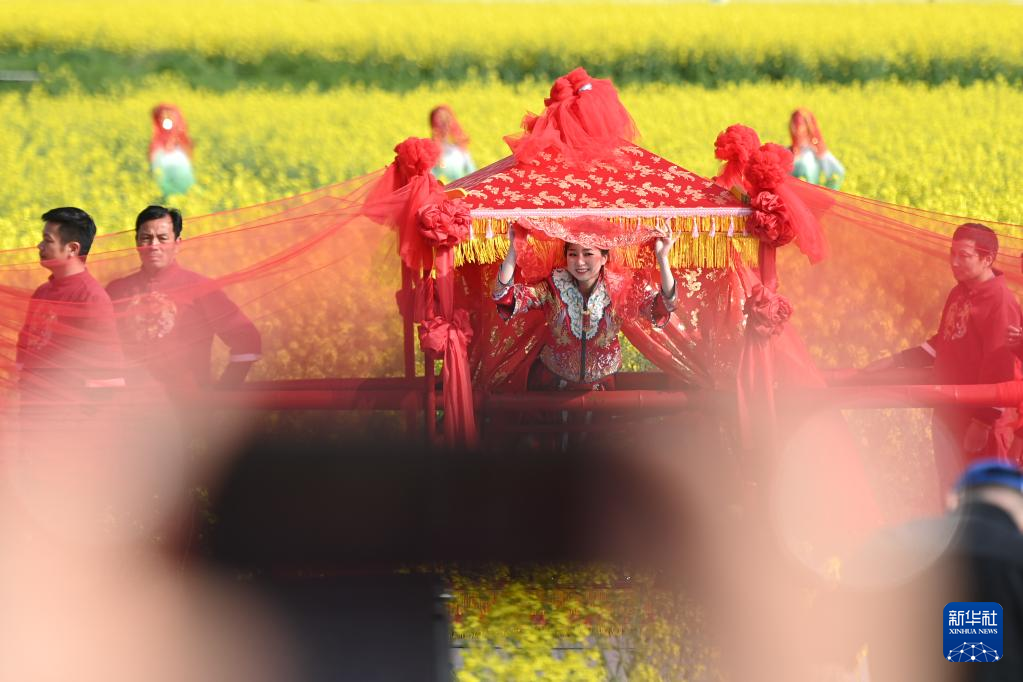 3月26日,演员在梅蓉村的油菜花田里表演“十里红妆”婚嫁场景。