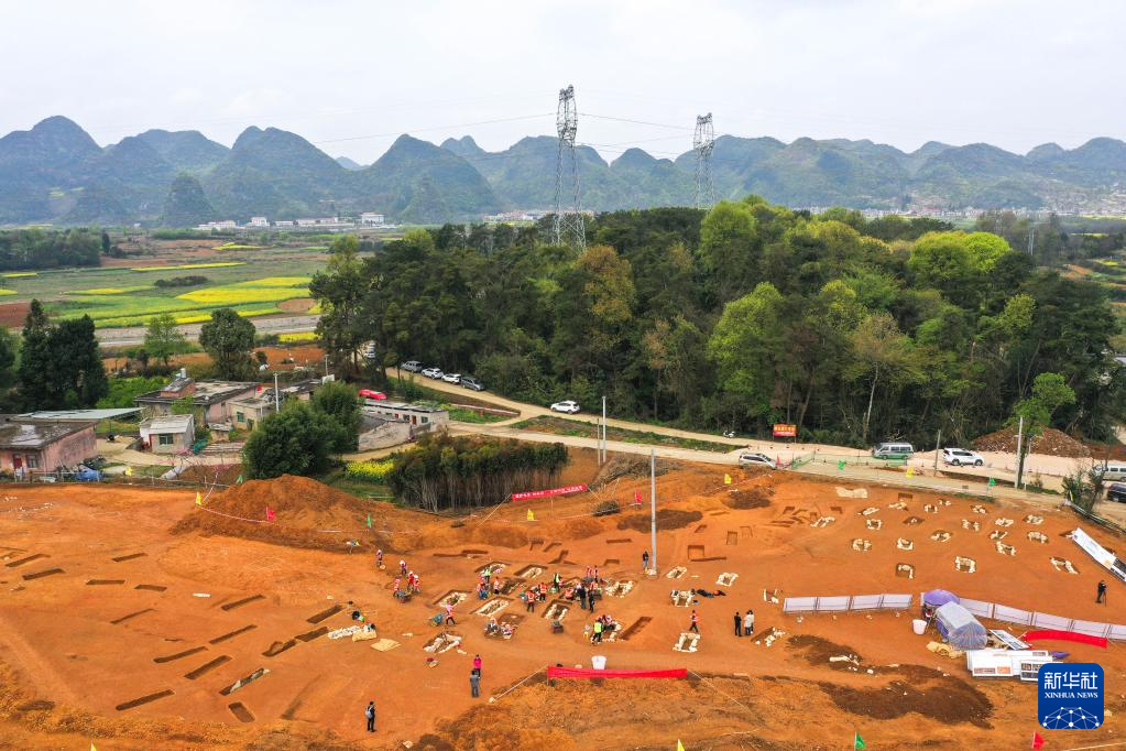 3月30日拍摄的贵州贵安新区大松山墓群挖掘现场(无人机全景照片)。