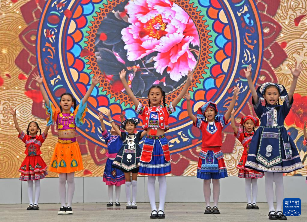 4月17日,孩子们在广西南宁市滨湖路小学表演民族歌舞。