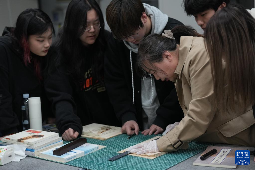 4月20日,王斌在鲁迅美术学院为文物保护与修复专业的学生进行线装书制作教学。