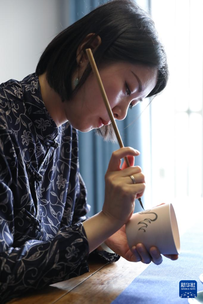4月19日,在江西景德镇,蔡文娟在“青花故事”创作基地绘制青花图案。