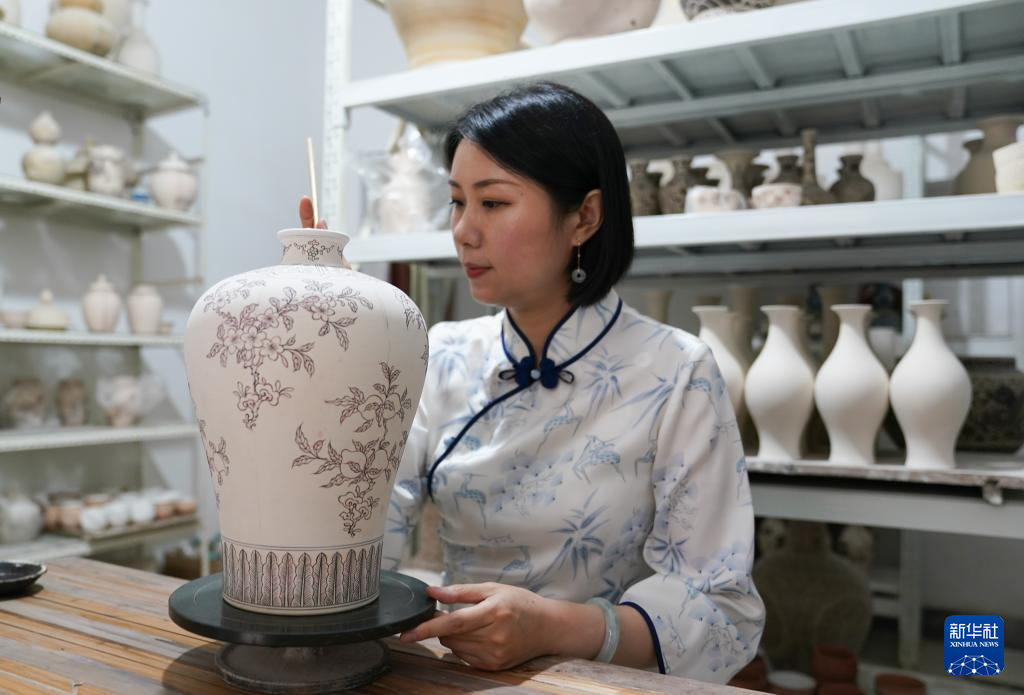 作为一名省级非遗传承人,蔡文娟不仅不断深研传统非遗技艺,还成为了一名创业者。她组建团队成立文创品牌,创新设计,让传统的青花元素衍生跨界;通过收集古陶瓷借鉴纹样,结合新的载体,设计出符合当代审美的青花产品。“景德镇传统陶瓷文化既需要代代守护,也需要与时俱进,这样才能让景德镇传统陶瓷文化在新时代焕发出新光彩。”