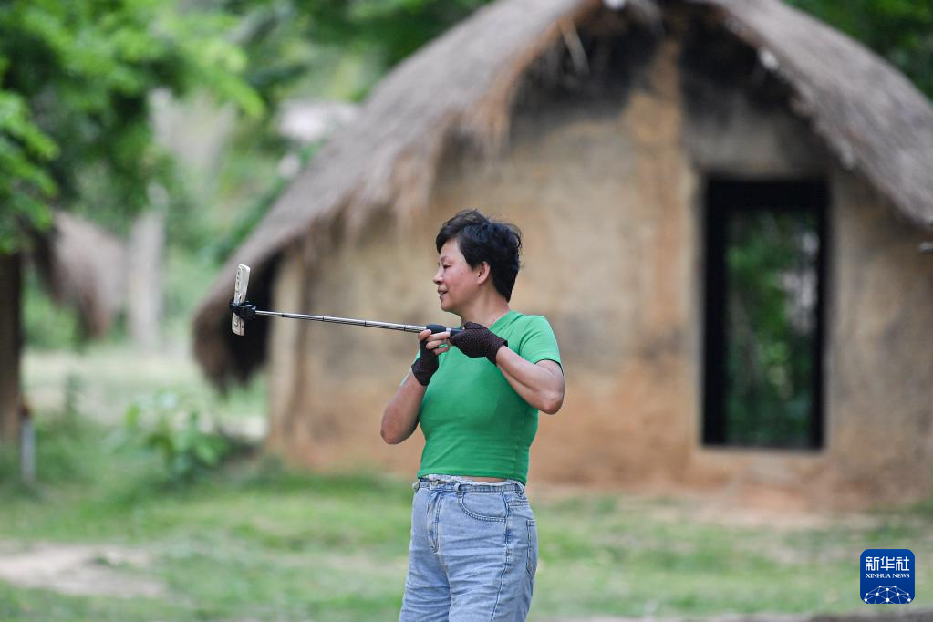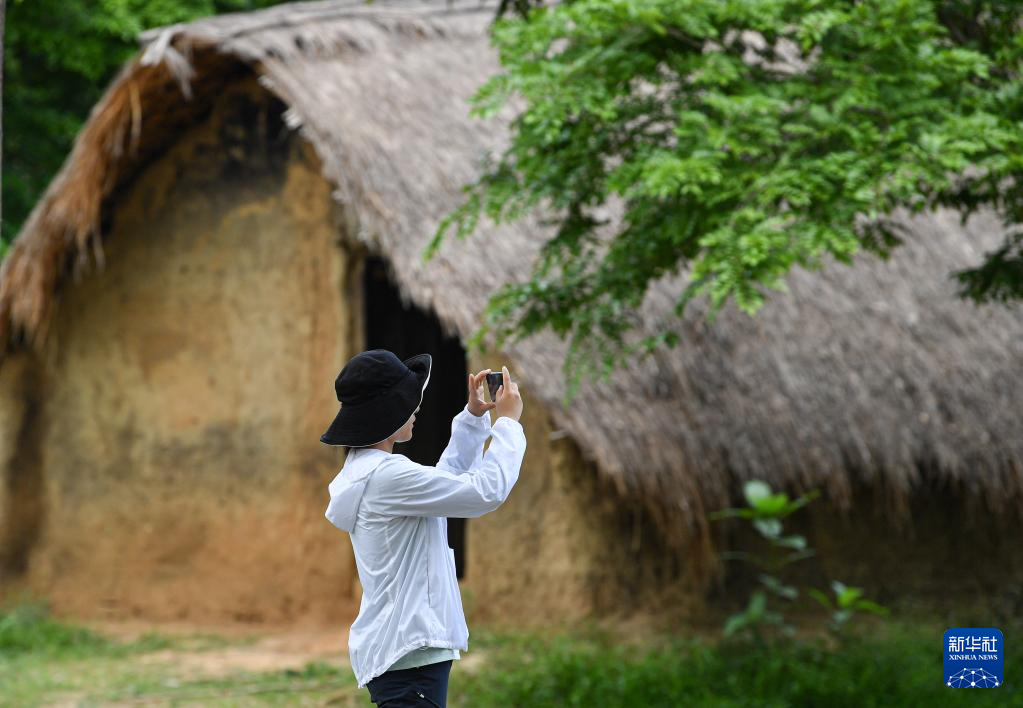 4月28日,游客在海南省东方市白查村参观、拍摄黎族船型屋。