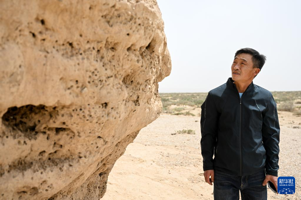5月13日,驼峰(长城)文物保护队员布音乌力吉在观察阿拉善左旗一处烽火台遗址表面,查看是否有人为破坏痕迹。