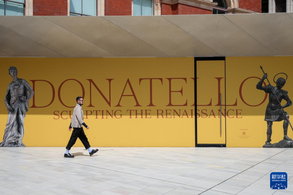 5月16日,在英国伦敦维多利亚与艾尔伯特(V&A)博物馆,一名男子走过文艺复兴时期雕塑家多纳泰罗作品展海报。