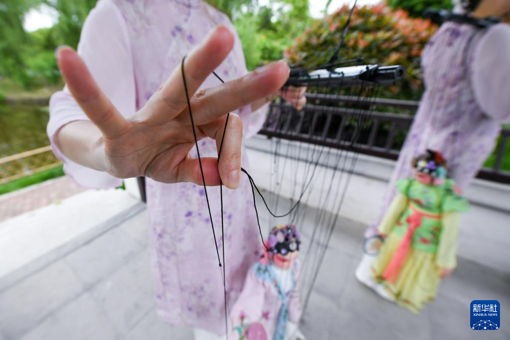 孙菁和施锦芳在苏州市吴江区七都镇一处公园内进行排练(4月18日摄)。他们手提十多根线操纵着约六十厘米高、七八斤重的木偶,通过手指、形体动作来操控木偶的动作神态。